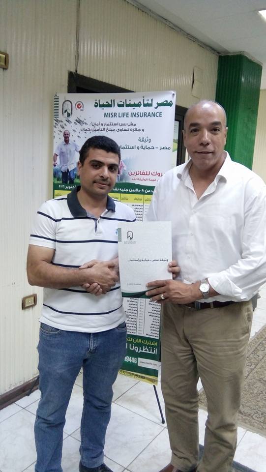 الباشمهندس احمد سعد شاف اعلان صفحتنا وعجبه جداا عروضنا وفورا قرر يجى شركتنا بميدان التحرير ميدان عبدالمنعم رياض ويقابل كابتن طارق عبده المعلق الرياضى والمستشار التامينى ويعمل وثيقه الحمايه والاستثمار ذات الجوائز لصالح اسرته بمبلغ 50000 الف جنيه وقد شرح له الكابتن مميزات الوثيقه وانها مثل ما كانوا يفعلون جدودنا زمان حينما كانوا يشتروا تجهيزات البنت او الولد منذ طفولتهم وان مصر لتامينات الحياة اكبر شركة تامين فى مصر والشرق الاوسط حكوميه