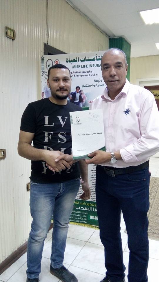 عادل رومانى زكى مصرى وصاحب مهنه ممتازه فى التكييف والتبريد جه علشان يعمل وثيقه لنفسه ولصالح زوحته واولاده ب 50000 الف جنيه حمايه واستثمار ذات الجوائز قسطها الشهرى 230 جنيه وكان فى استقباله وتسليمه الوثيقه الكابتن طارق عبده المعلق الرياضى والمستشار التامينى .